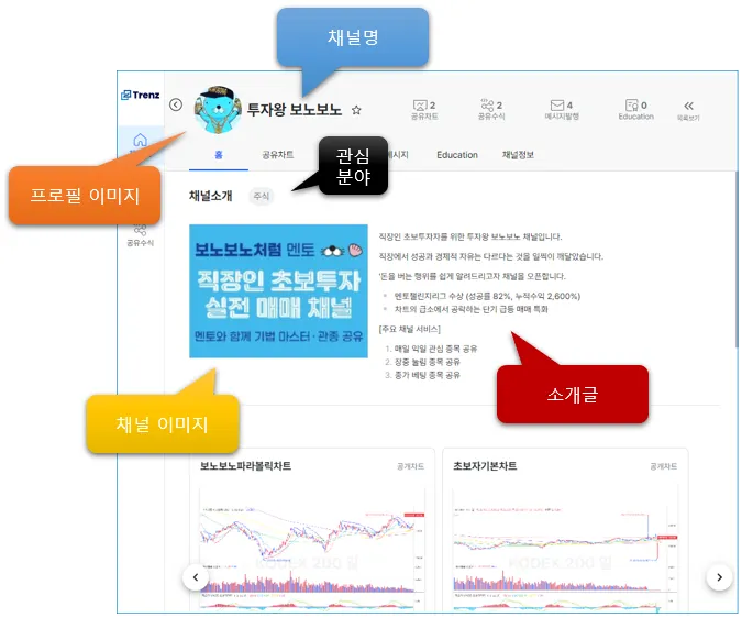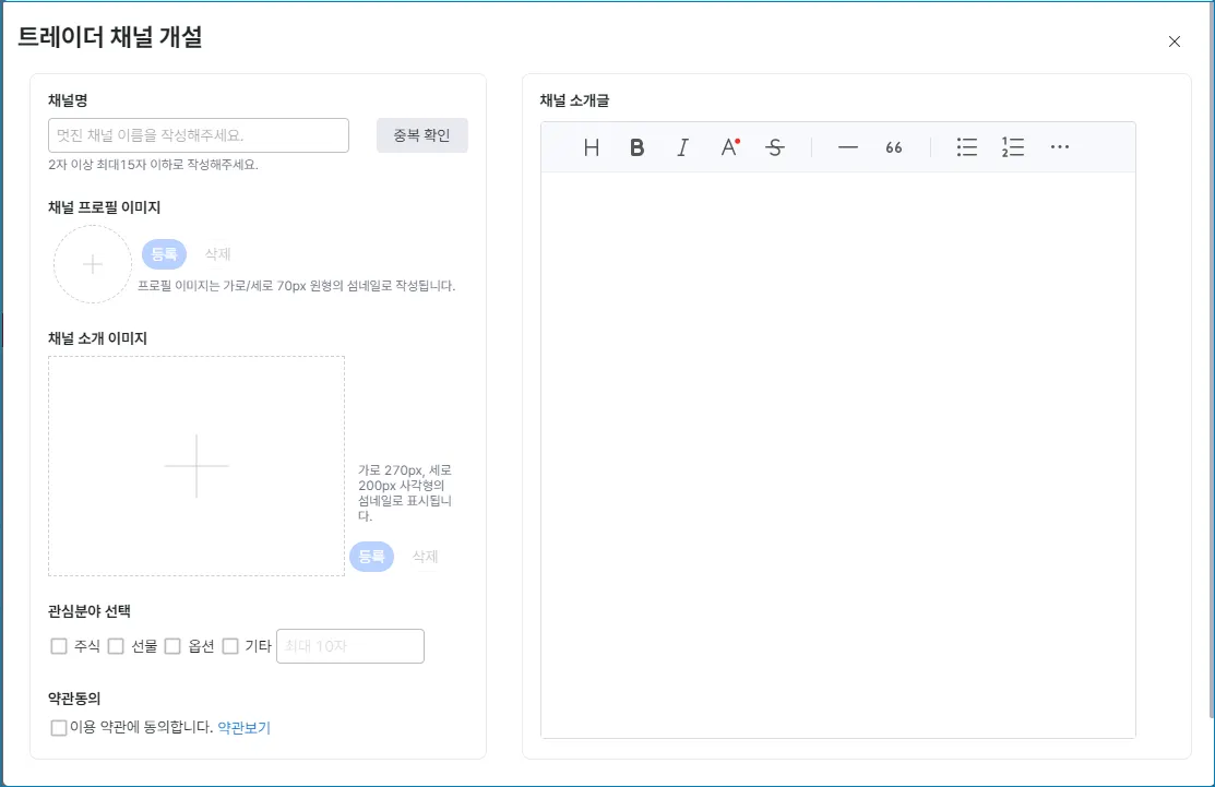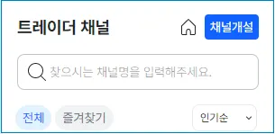 트레이더 채널화면 상단에서 채널개설을 선택하면 나만의 채널을 만들 있습니다.