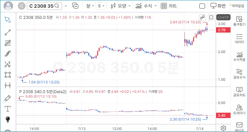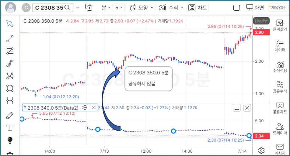 예를 들어 옵션 교차차트를 보기위해 기본종목이 콜종목인 차트에