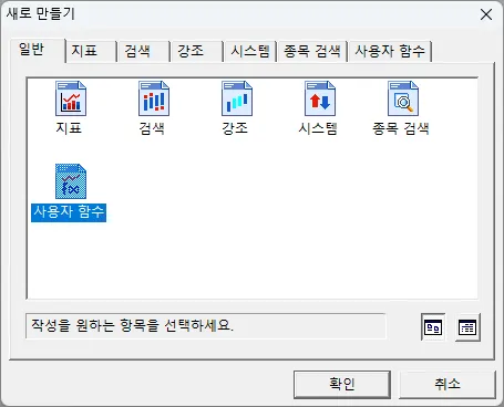 편집기 상단 파일메뉴 → 새로만들기 → 일반탭에서 사용자함수 아이콘 선택 → 확인