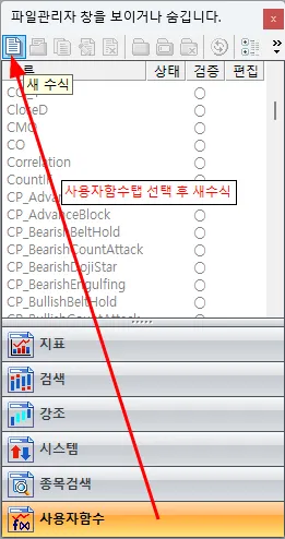 b. 파일관리자 → 사용자함수탭 선택 → 상단 파일관리도구에서 새수식 아이콘 클릭