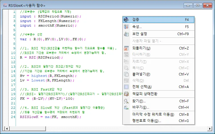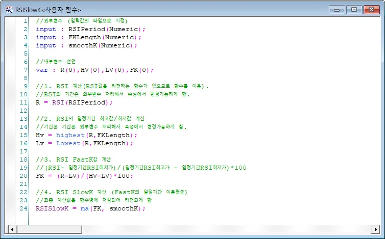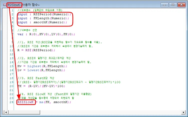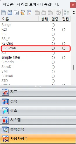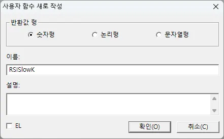 작성예에서는 RSI SlowK값을 사용자함수로 만들어