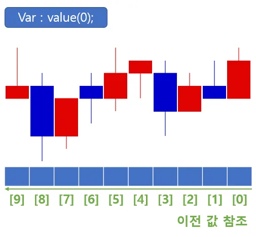 일반변수는 봉마다 한개의 공간을 가지고 하나의 값만 저장이 가능한 변수입니다.
