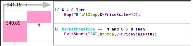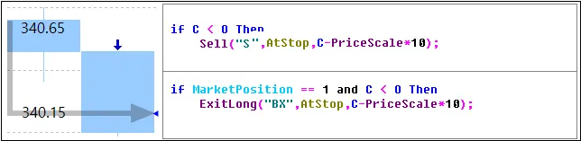 위와 같이 AtStop은 진입함수에서는 진입 방향으로 가격이 더 움직이는 것을 확인하고 신호를 발생할 때 사용하며 청산함수에서는 진입 후 가격이 반대로 움직여 수익이 감소하거나 손절할 때 사용하게 되어 보통 위험회피형 타입이라고 합니다.