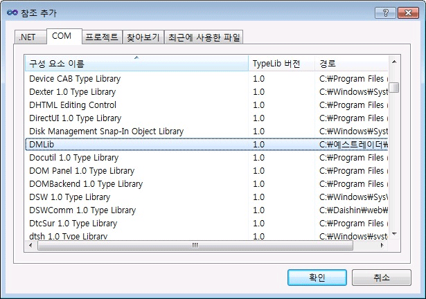 클래스 등록 : 윈도우 명령창에서 regsvr32 DMLib.dll 입력