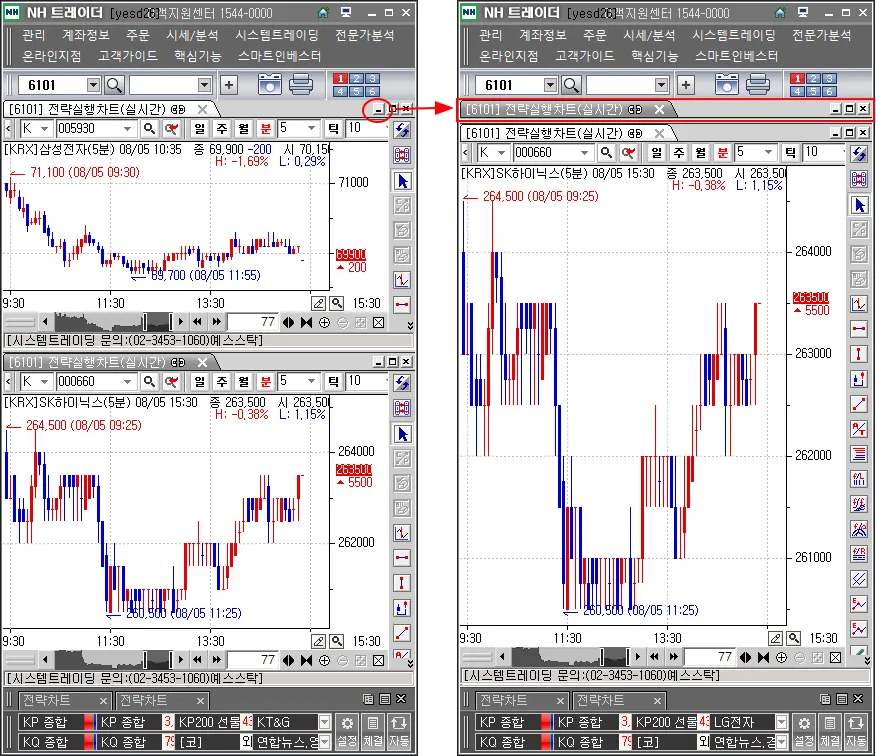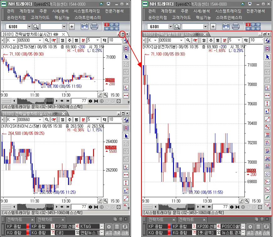 최대화버튼도킹된 화면을 메인화면 내에서 가장 크게 키우는 기능입니다. 일반 크기의 화면에서 최대화되었을 때는 최대화 버튼이