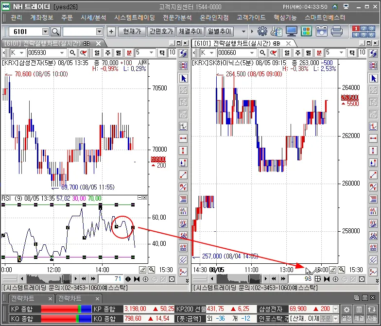 ④ RSI지표나 Stochastics지표처럼 봉차트와 다른 Y축을 사용하는 지표를 다른 차트로 복사할 경우