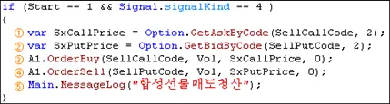 ⑤. 메시지로그 함수를 이용해 합성선물매도청산이라는 텍스트를 출력합니다.