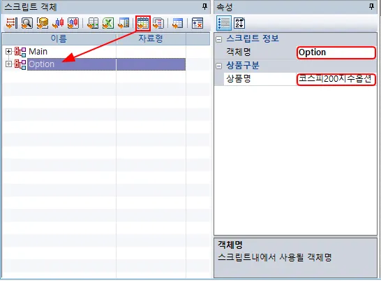 객체명은 Option, 상품은 코스피200지수옵션으로 지정합니다.