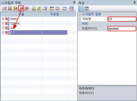 예제에서는 객체명을 C1으로 하고 차트아이디는 System으로 합니다.