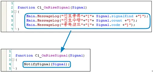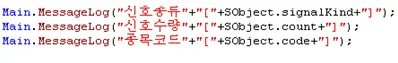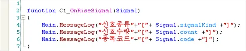 아래의 식은 완성신호가 발생하면 완성신호의 종류와 수량, 종목코드를 디버깅화면에 출력하게 됩니다.