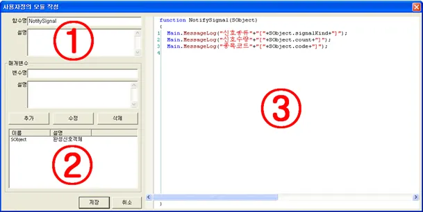 사용자정의 모듈 작성화면에서 함수명과 매개변수를 우선 지정하고 함수식 내용을 작성하시면 됩니다.① 함수명을 입력합니다. 설명은 생략할 수 있습니다.