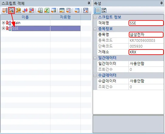 속성화면에서 종목은 삼성전자로 설정하고 객체명은 SSE로 지정합니다.