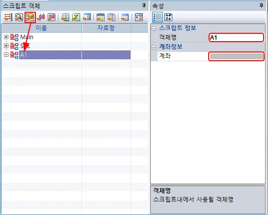 객체명은 A1로 지정하고 주문 낼 계좌번호를 지정합니다.
