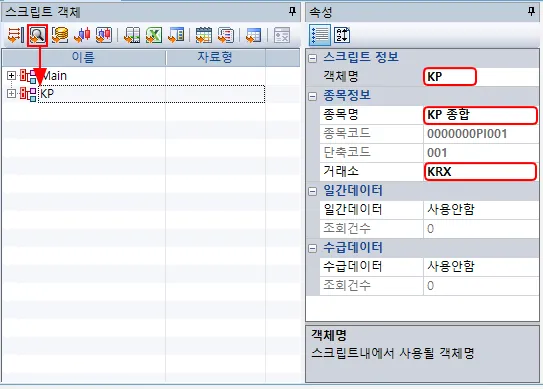 예제에서는 KP로 지정하고 종목은 지수인 KP종합로 지정하고 시세거래소는 KRX로 지정합니다.