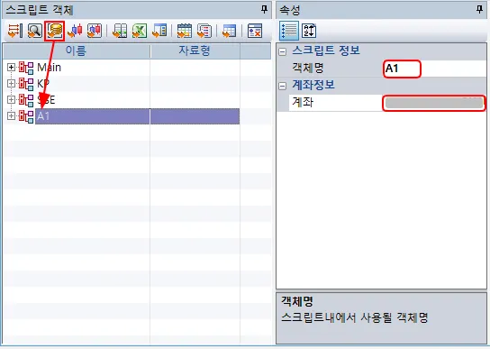 스크립트 객체화면에서 계좌객체명을 클릭하면