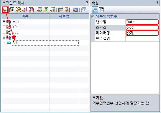 외부변수는 추가 후 속성화면에서 변수명, 초기값, 데이터형을 지정해 주시면 됩니다.