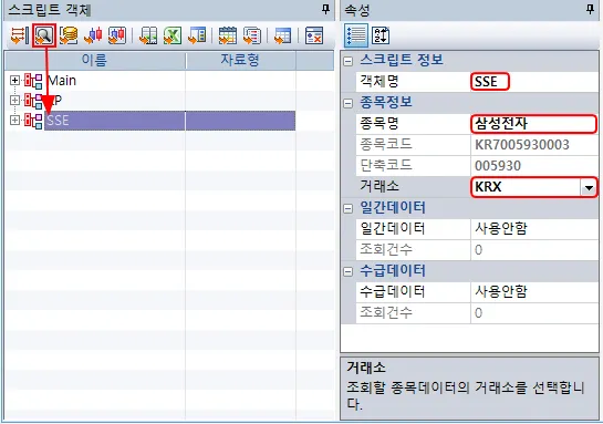 객체명은 SSE, 종목은 삼성전자로 설정하고 시세 거래소는 KRX로 지정합니다.