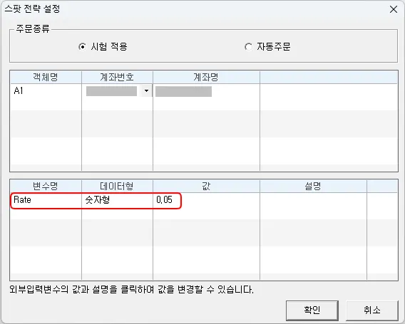 외부변수를 사용하면 [예스스팟]화면에서 전략을 실행할 때