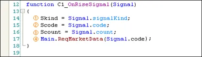 ② 변수(Scode)에 완성신호의 종목코드를 저장합니다. 변수는 전역변수로 선언합니다.