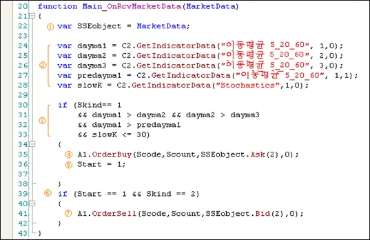 ⑦ 매수와 같이 주문종목코드와 주문수량은 완성신호 이벤트발생할 때 저장한 값을 이용하고