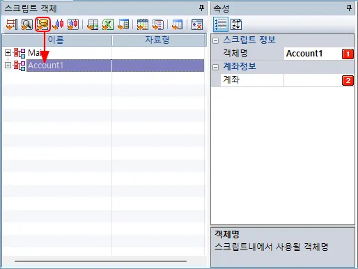 버튼을 클릭하면 스크립트 객체화면에 계좌객체가 추가됩니다. 속성화면에서 객체명과 계좌번호를 지정하면 됩니다.