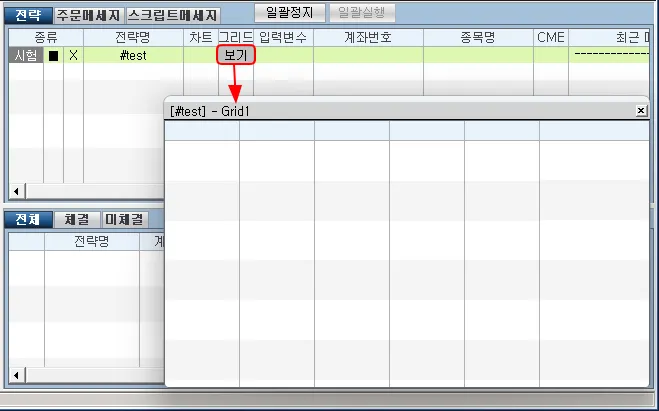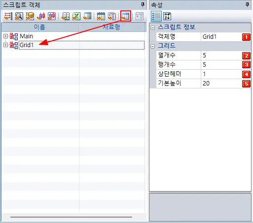 버튼을 클릭하면 스크립트 객체화면에 그리드객체가 추가됩니다.
