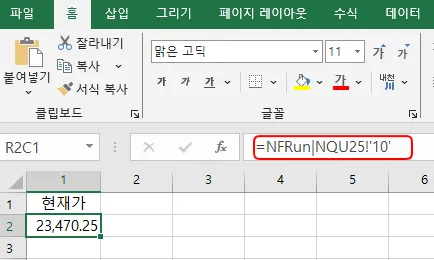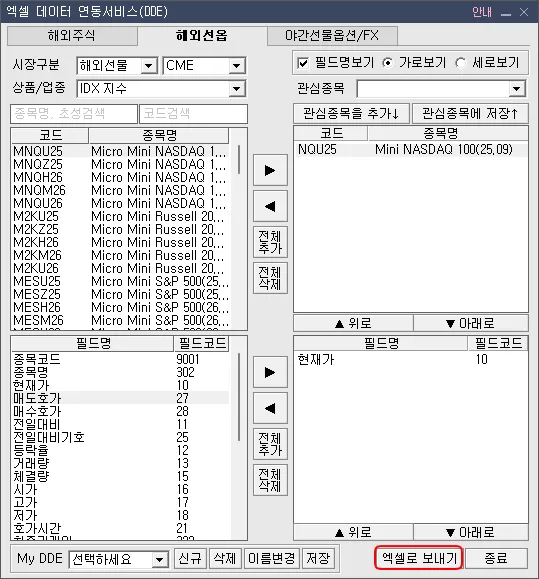 엑셀로 보내기를 해보시면 엑셀에 지정한 종목의 값이 출력됩니다.
