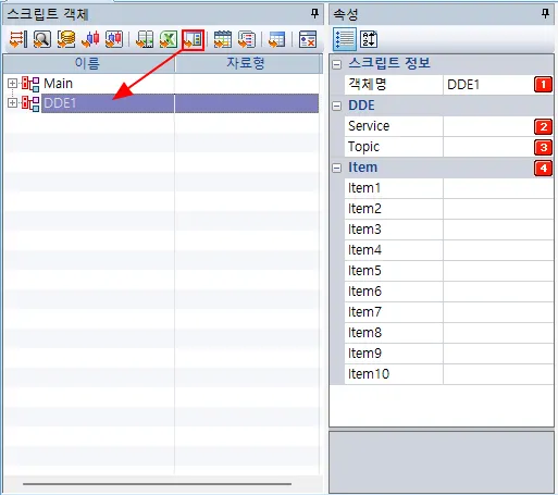 버튼을 클릭하면 스크립트 객체화면에 DDE객체가 추가됩니다.