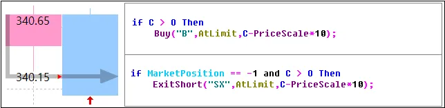 위와 같이 AtLimit은 진입함수에서는 진입 반대방향으로 가격이 움직이는 것을 확인하고 신호를 발생할 때 사용되며 청산함수에서는 진입 방향으로 움직여 일정 수익이 발생할 때 사용되어 보통 수익추구형 타입이라고 합니다.
