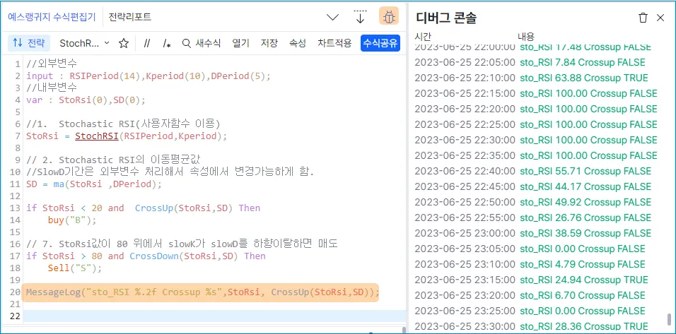 수식을 작성하고 적용하게 되면 작성자의 의도와는 다르게 결과가 발생하는 경우가 발생하기도 합니다. 지표식의 경우에는 사용되는 변수나 함수, 계산식 등을 하나씩 지표로 출력하면서 잘못된 점을 찾아 수정할 수도 있지만 전략식의 경우에는 지표출력함수가 같이 사용될 수 없고 반대로 지표식에는 포지션함수 등이 사용될 수 없으므로 지표식으로 수식의 오류를 찾는 것에 어려움이 있습니다.