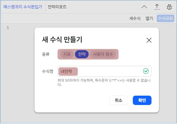 수식은 지표식, 전략식, 사용자함수 중 선택해서 작성할 수 있고