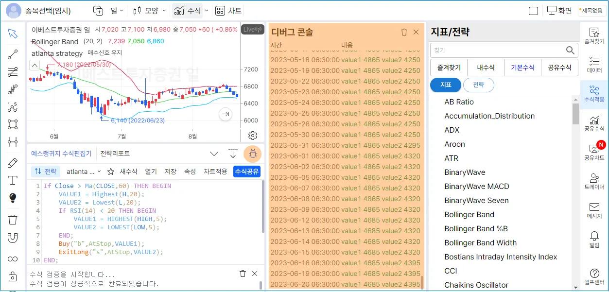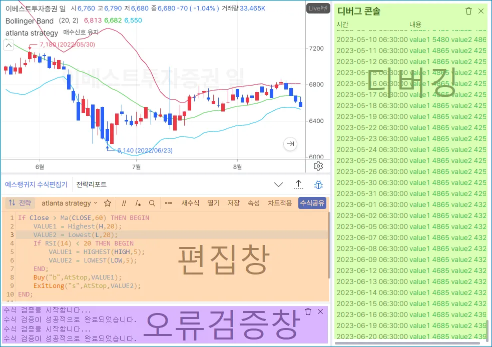 예스랭귀지 수식편집기는 편집창, 오류검증창, 디버깅창으로 구성됩니다.