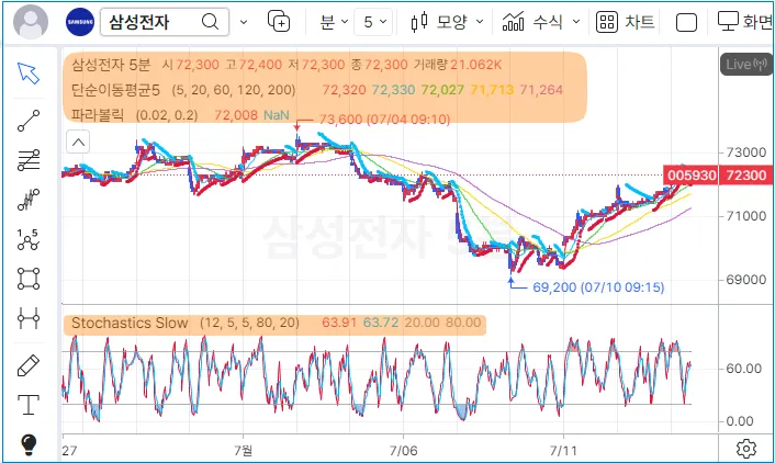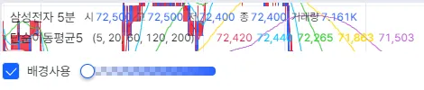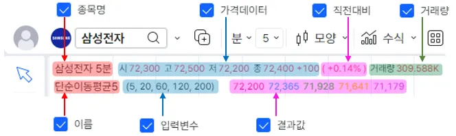 차트 왼쪽 상단에는 종목 정보나 수식(지표, 전략)의 값과 내용이 표시가 됩니다.