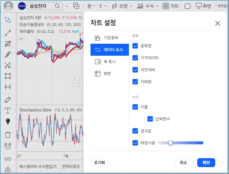 결과값 : 선택/해제로 지표와 전략의 값과 내용을 보이거나 숨길 수 있습니다.