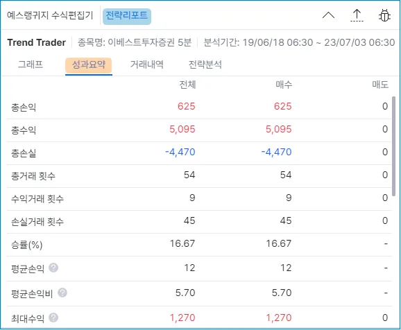 전략의 조정 성과와 특이치 제거 성과등의 항목을 조회할 수 있습니다.