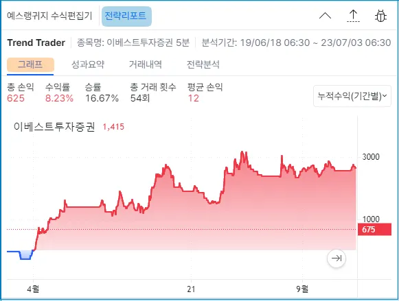 차트에 전략이 적용되면 전략리포트에 전략의 손익보고서를 볼 수 있습니다.