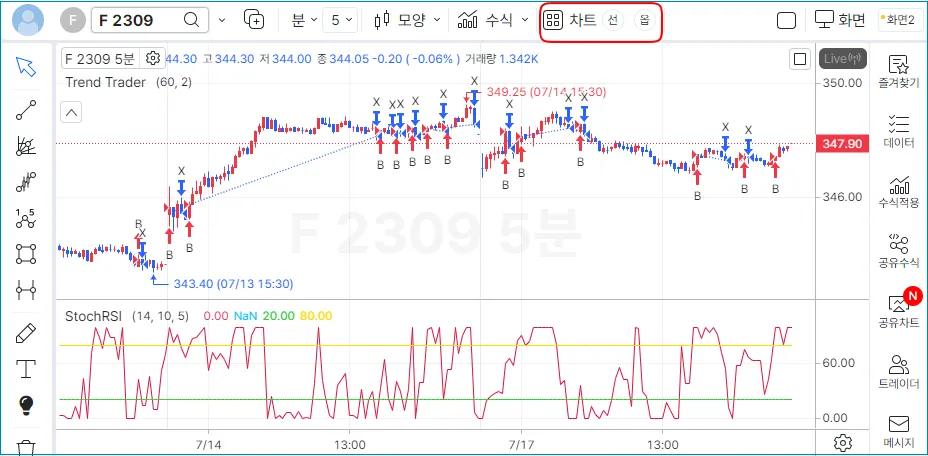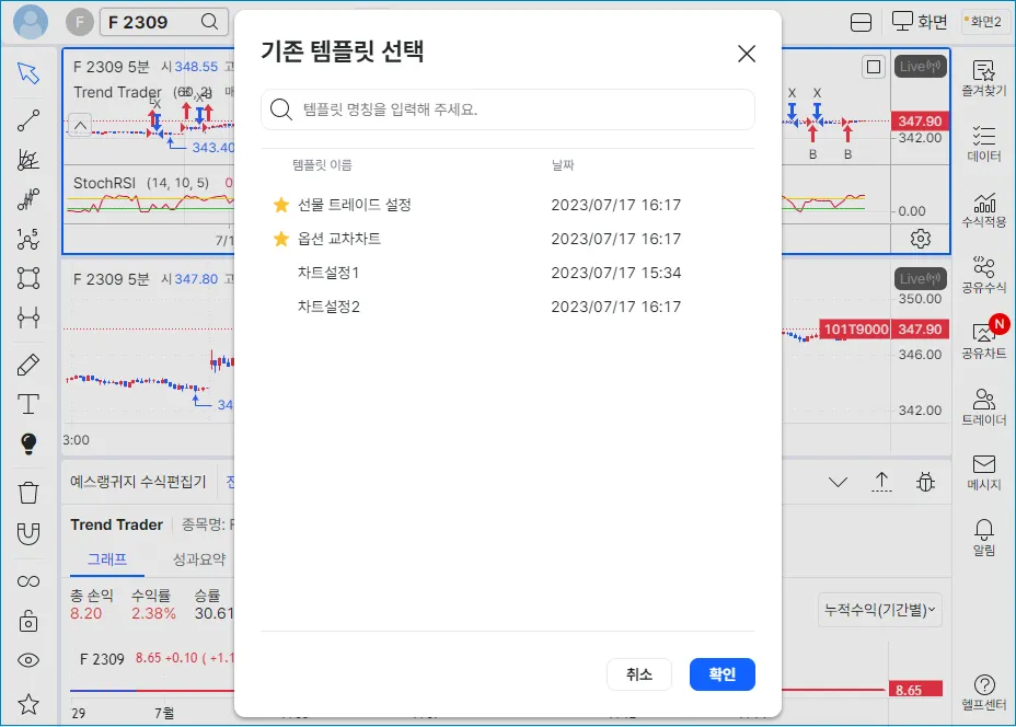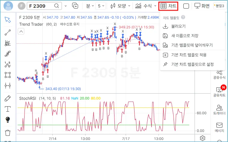 차트상단 차트 버튼을 클릭하면 차트 템플릿을 저장하거나 불러오기가 가능합니다.