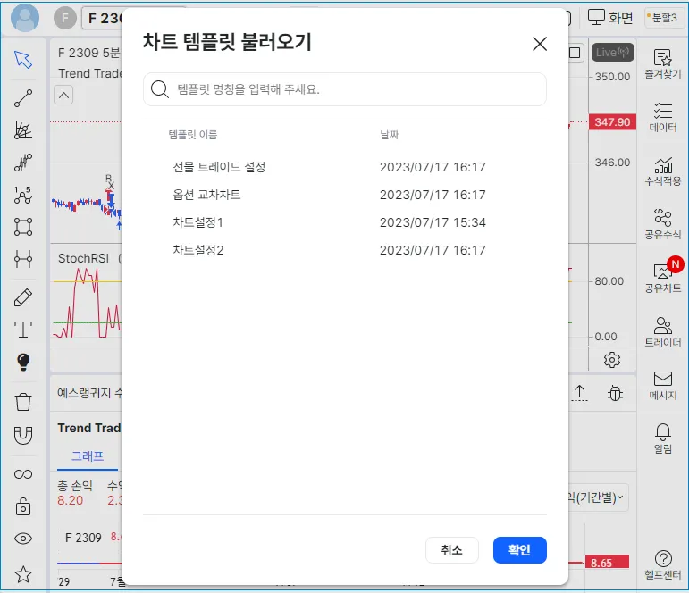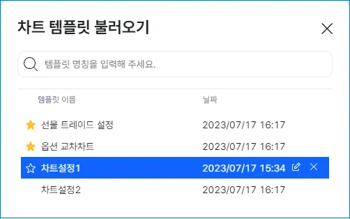 불러오기를 클릭하면 저장된 차트 템플릿들이 리스트됩니다.