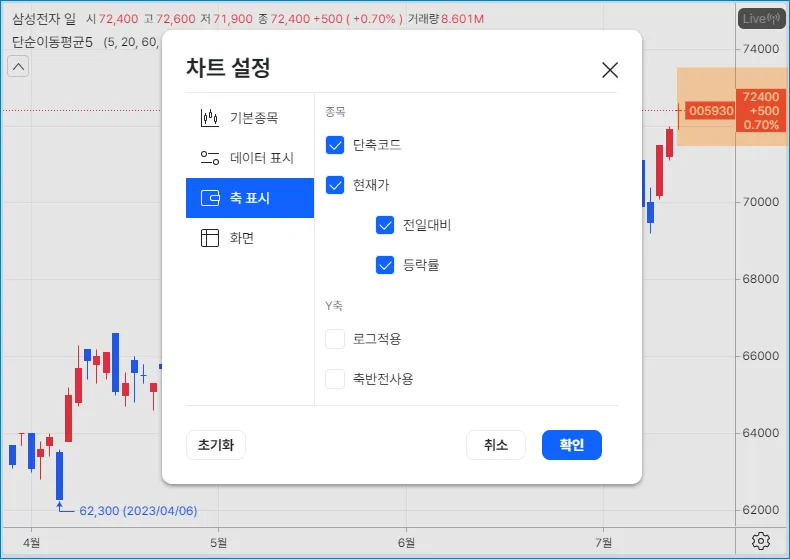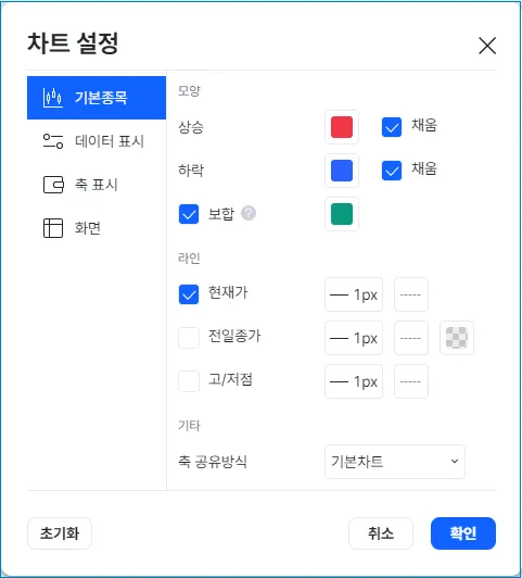 차트설정은 설정버튼 → 차트설정을 선택하면 나타납니다.