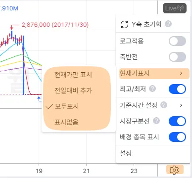 차트 오른쪽 하단 설정버튼 → 현재가 표시에서도 설정을 할 수 있습니다.