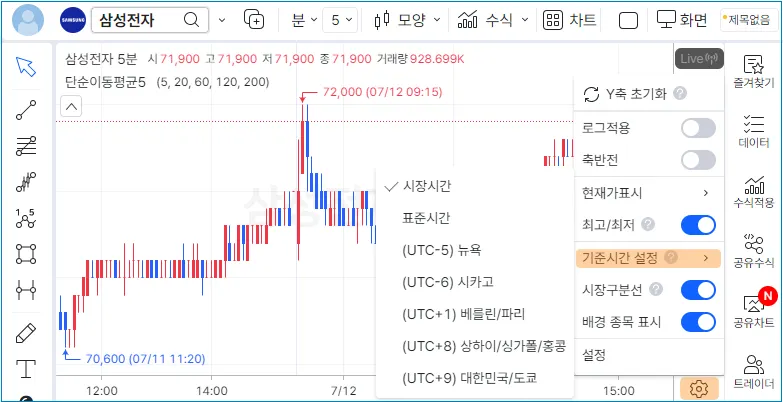 차트의 시간축의 기준을 변경할 수 있습니다.