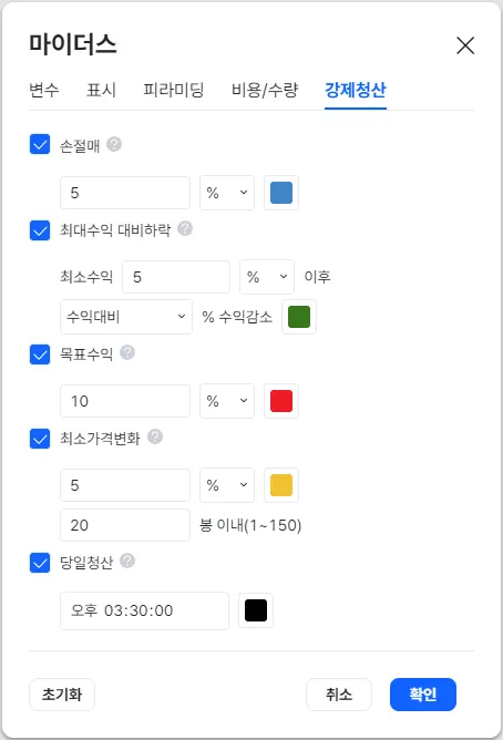 전략의 포지션 강제청산과 관련된 항목을 설정할 수 있습니다.