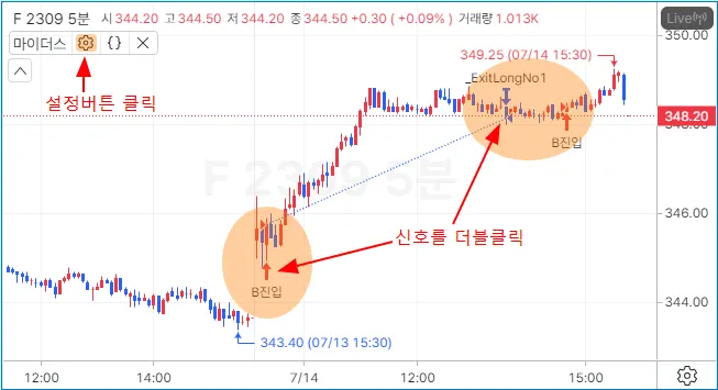 전략 속성화면은 차트에서 신호를 더블클릭하거나