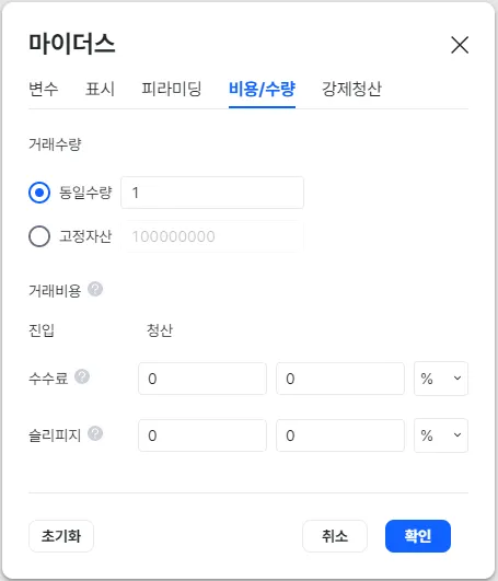 매매대상 종목의 거래 수량과 비용(수수료, 슬리피지)을 지정할 수 있습니다.