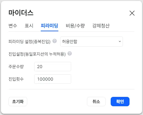 전략을 분할 진입을 하는 내용으로 작성했다면 전략 적용 시 항상 피라미딩을 설정해야 합니다. 피라미딩은 기본설정이 허용안함이므로 별도로 허용을 설정하지 않으면