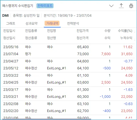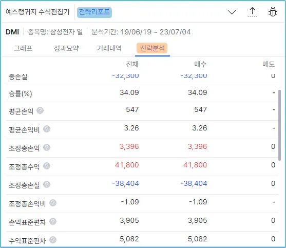 전략의 조정 성과와 특이치 제거 성과등의 항목을 조회할 수 있습니다.