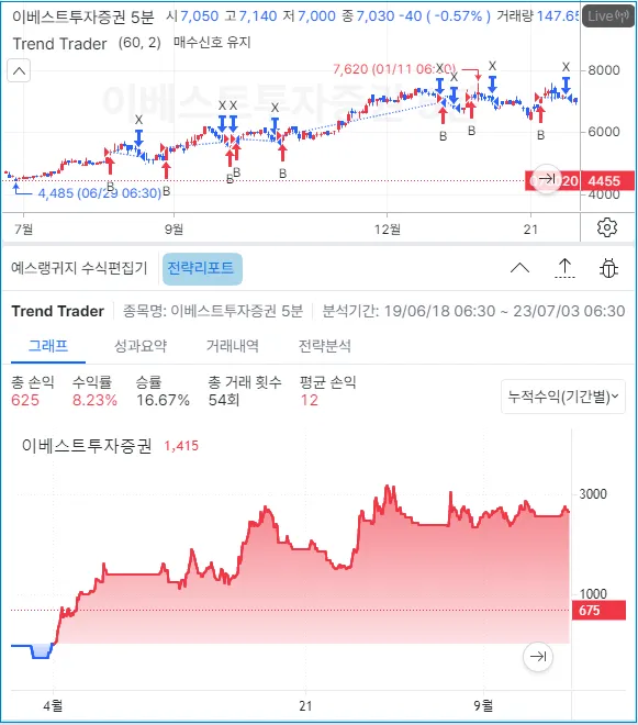 차트에 전략이 적용되면 전략리포트에 전략의 손익보고서를 볼 수 있습니다.