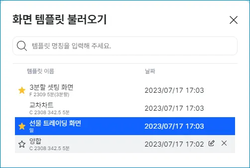 불러오기를 클릭하면 저장된 화면 템플릿들이 리스트됩니다.