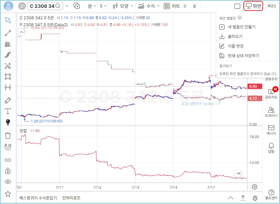 화면 템플릿 즐겨찾기는 차트상단 화면 버튼을 클릭하면 나오는 메뉴에 표시가 됩니다.