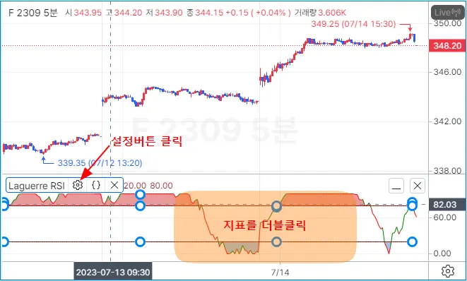 차트에 적용된 지표의 외부변수나 그래프 모양등 설정을 변경할 수 있습니다